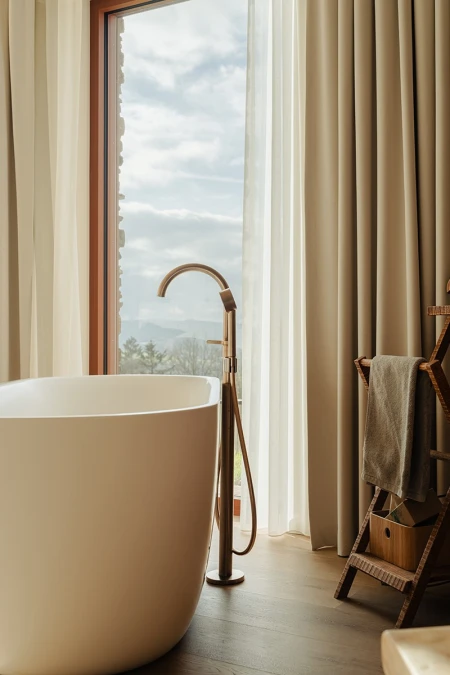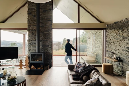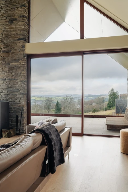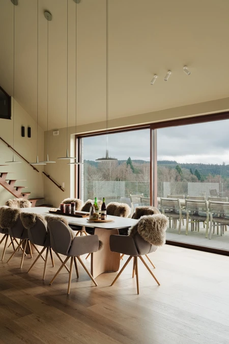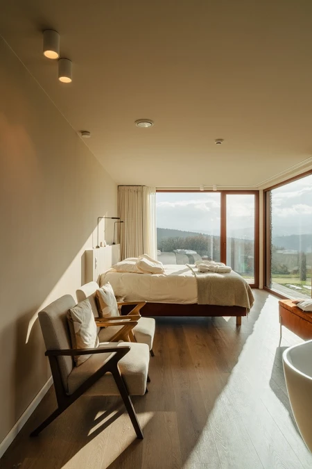 Al llegar, lo primero que llama la atención son las impresionantes vistas. Gracias a los grandes ventanales, el paisaje panorámico se introduce en el interior como un cuadro vivo. Se ha optado deliberadamente por una distribución abierta, para que la luz y el espacio sean los protagonistas. Cada detalle del interior refuerza esa sensación de armonía con la naturaleza.