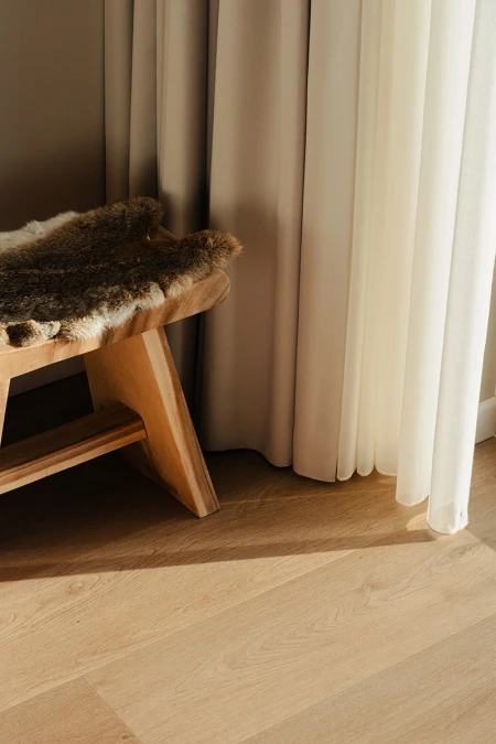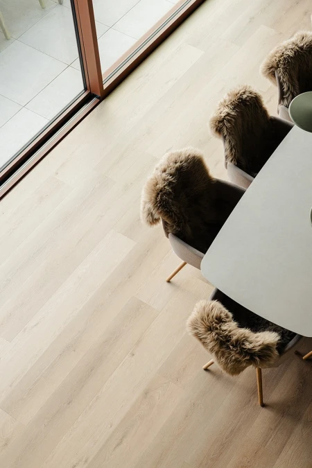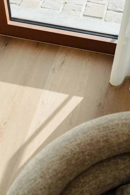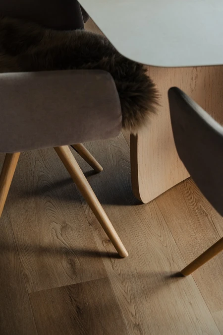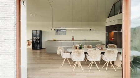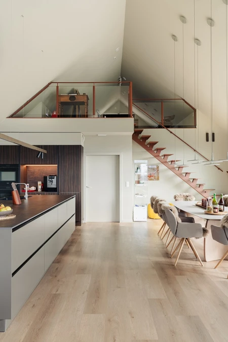 Para el acabado del suelo se eligió el Parquetvinyl. Una decisión que encaja a la perfección, tanto estética como prácticamente, con el concepto de la vivienda. El aspecto natural de la madera aporta calidez a los espacios modernos, mientras que sus propiedades de fácil mantenimiento son ideales para una vivienda vacacional de uso intensivo. ¿El resultado? Un suelo que no solo es bonito, sino que también resiste el día a día.